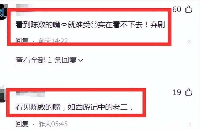 本来就有很多观众因为陈数不满,一是她扮演的女主周颖人设非常不讨喜,二是陈数的那个嘴真的是一言难尽,没以前漂亮了。